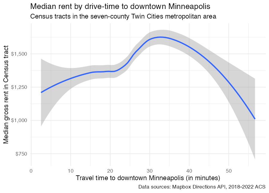 labs(x = "Travel time to downtown Minneapolis (in minutes)",