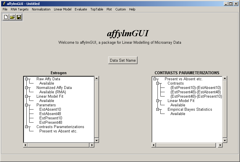 affylmGUI is a Graphical User Interface for analysis of Affymetrix microarray data, using Gordon Smyth's limma package (Linear Modes for MicroArray data). limma and affylmGUI are both R packages. The limma package offers R users a command-line interface to state-of-the-art techniques for linear modelling of microarray data and for identifying differentially expressed genes. The affylmGUI package, while not as powerful as limma to the expert user, offers a simple point-and-click interface to many of the commonly-used limma and affy functions. To use the affylmGUI package, you need to have R 1.8.1 or later, Tcl/Tk 8.3 or later (ActiveTcl for Windows/Linux or Fink Tcl/Tk for MacOSX (X11)) and the limma, affylmGUI, tkrplot R packages. The affyPLM (Bioconductor), R2HTML (CRAN) and xtable (CRAN) packages are recommended. The limma and affyPLM packages are available on Bioconductor, the affylmGUI package is available here, and the other packages are available from CRAN. affylmGUI has been succesfully tested on Windows 2000, Windows XP, and Red Hat Linux, and on Mac OSX with X11.