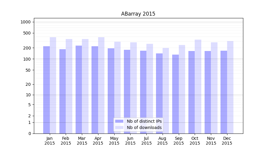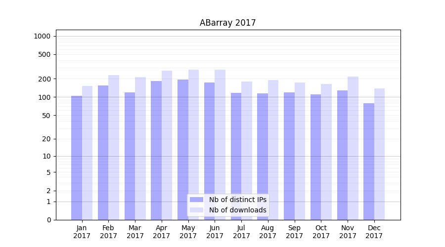 Number of downloads for software package ABarray, year by year, from 2025 back to 2014 (years with no downloads are omitted):