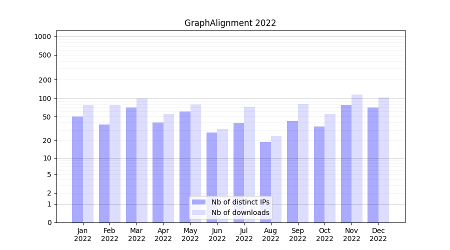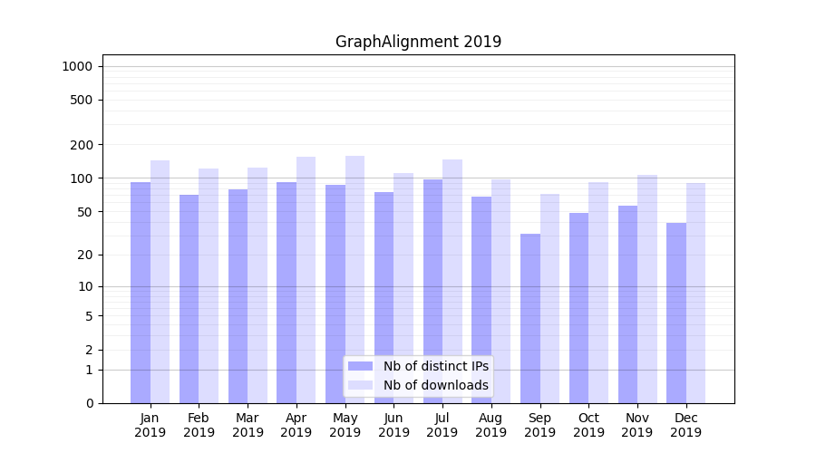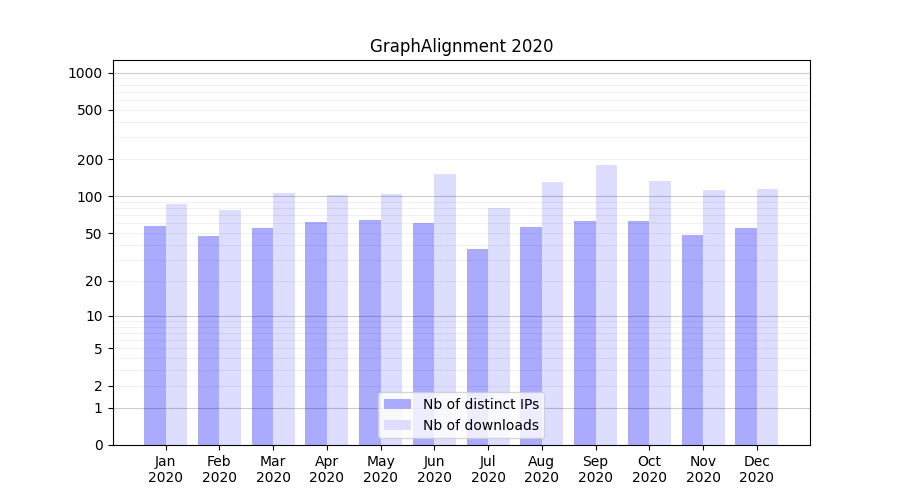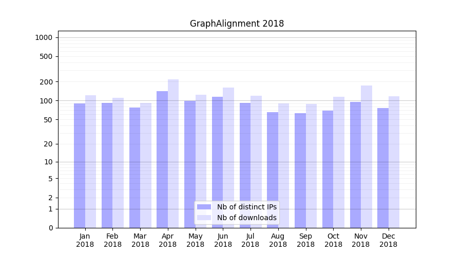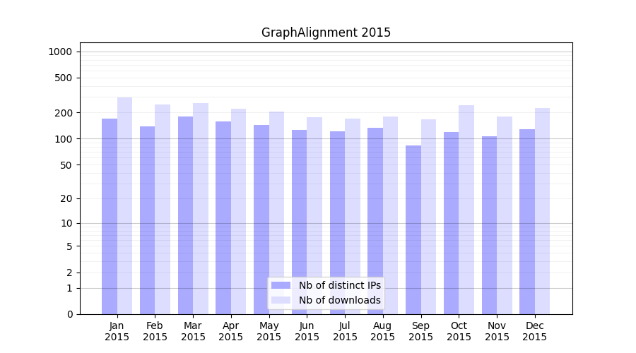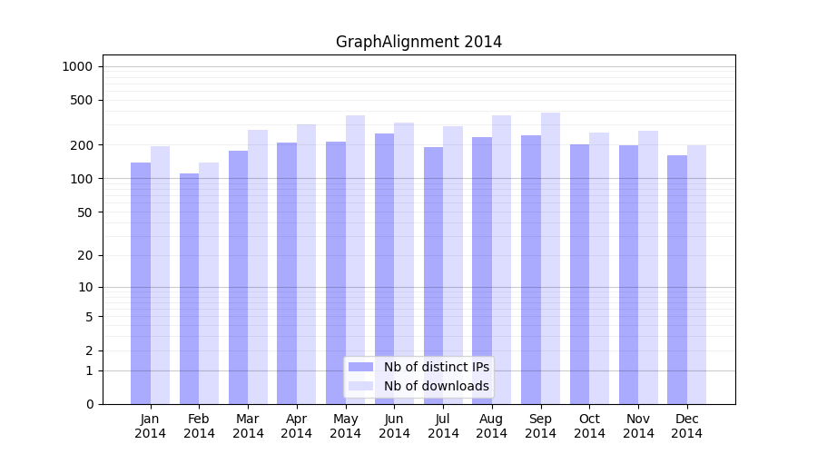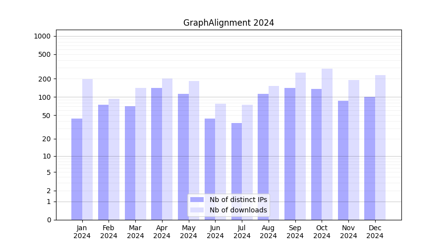 Number of downloads for software package GraphAlignment, year by year, from 2025 back to 2014 (years with no downloads are omitted):