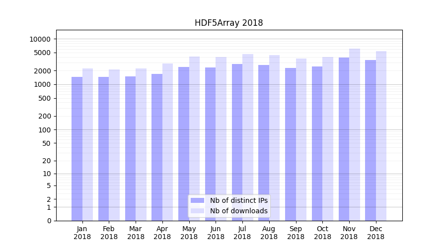 Number of downloads for software package HDF5Array, year by year, from 2025 back to 2014 (years with no downloads are omitted):