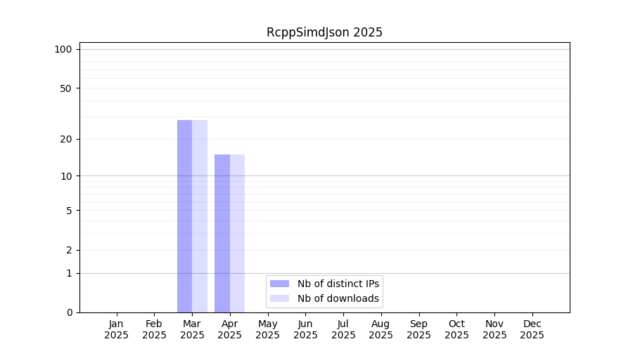 Number of downloads for software package RcppSimdJson, year by year, from 2025 back to 2014 (years with no downloads are omitted):