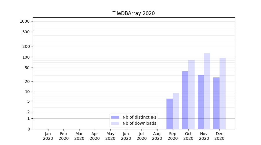 Number of downloads for software package TileDBArray, year by year, from 2025 back to 2014 (years with no downloads are omitted):