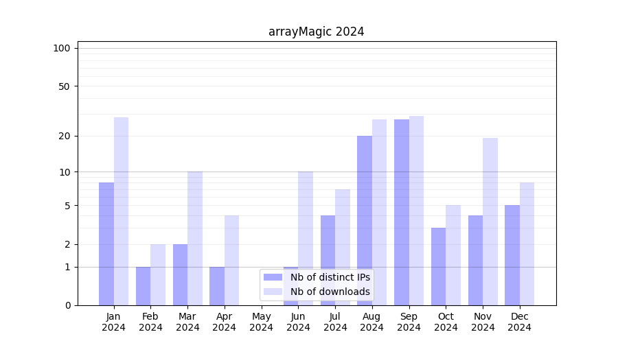 Number of downloads for software package arrayMagic, year by year, from 2025 back to 2014 (years with no downloads are omitted):