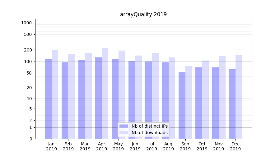 Number of downloads for software package arrayQuality, year by year, from 2025 back to 2014 (years with no downloads are omitted):