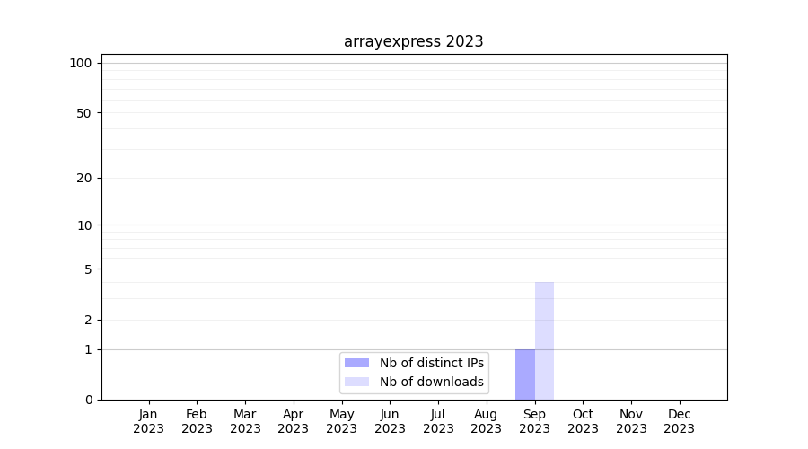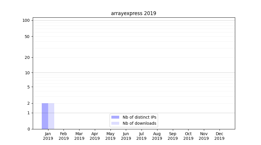 Number of downloads for software package arrayexpress, year by year, from 2025 back to 2014 (years with no downloads are omitted):