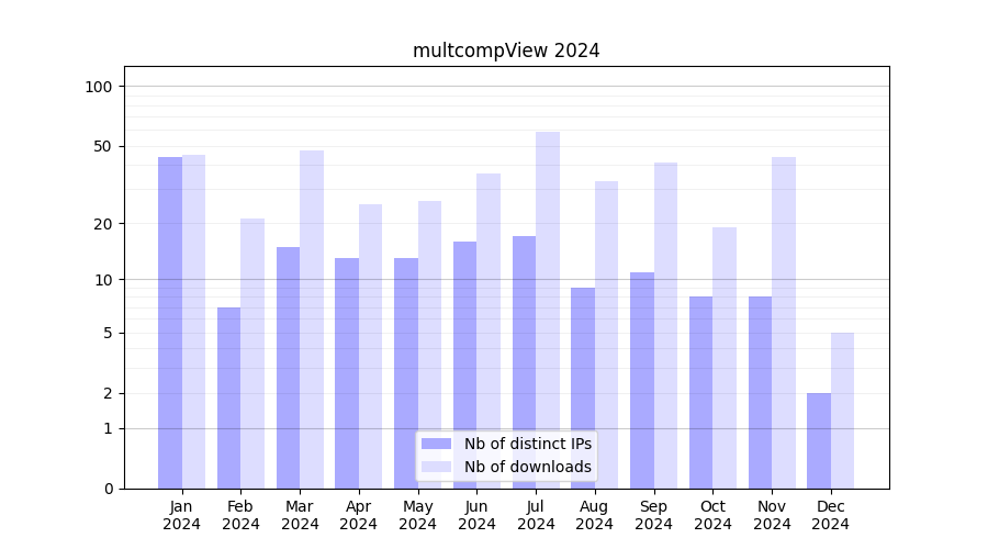 Number of downloads for software package multcompView, year by year, from 2025 back to 2014 (years with no downloads are omitted):
