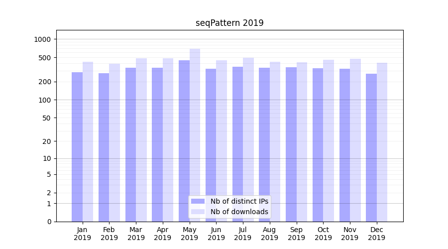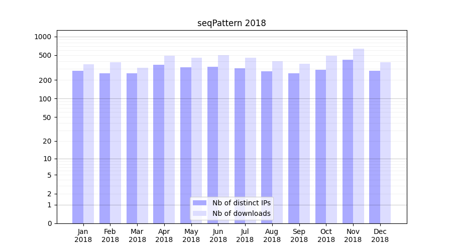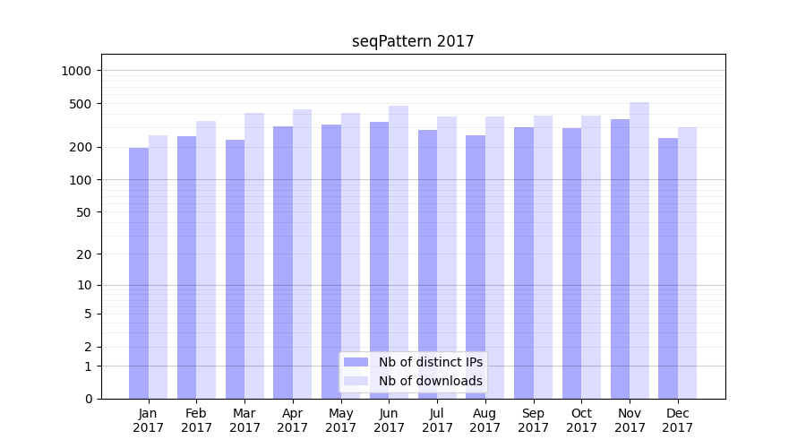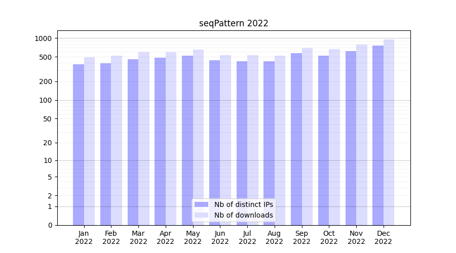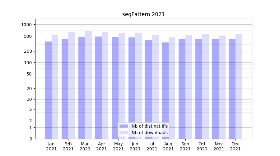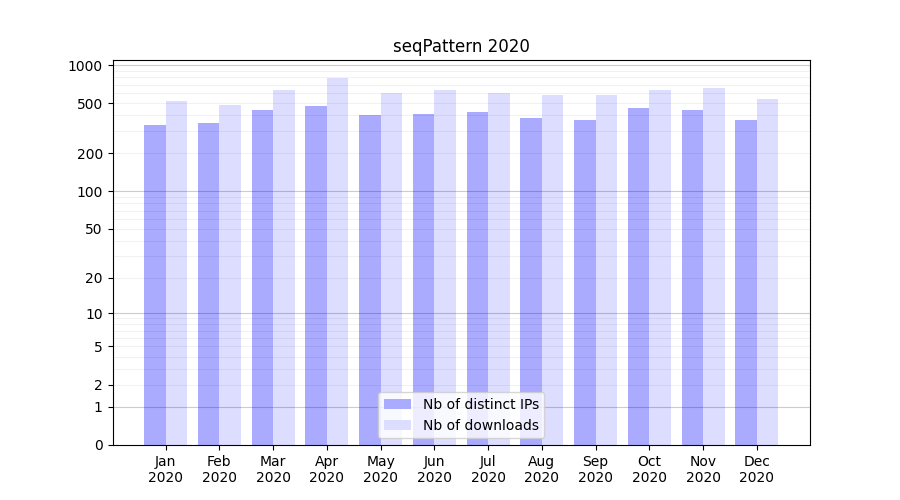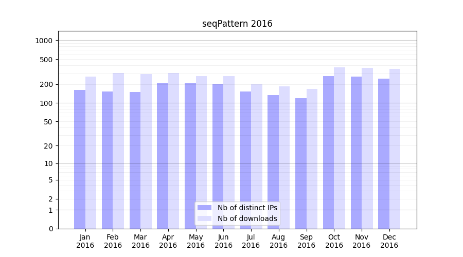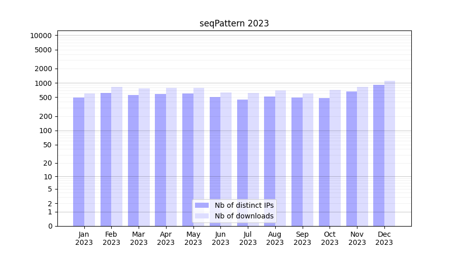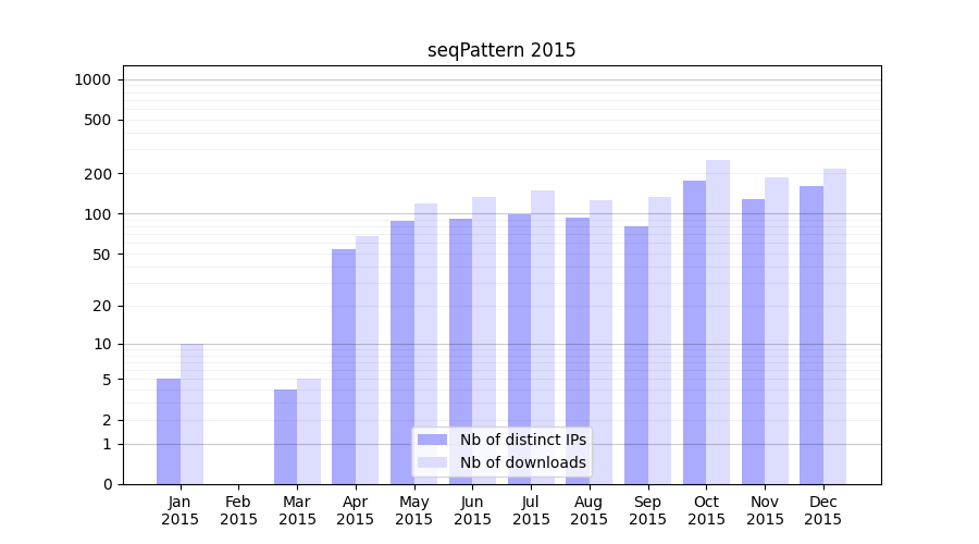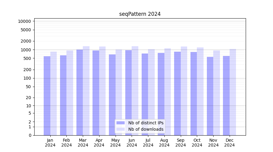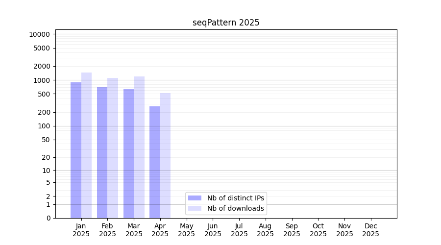 Number of downloads for software package seqPattern, year by year, from 2025 back to 2014 (years with no downloads are omitted):