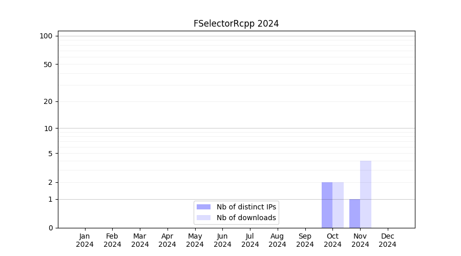 Number of downloads for annotation package FSelectorRcpp, year by year, from 2025 back to 2014 (years with no downloads are omitted):