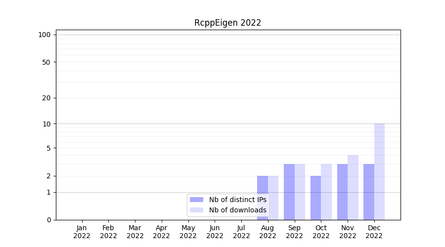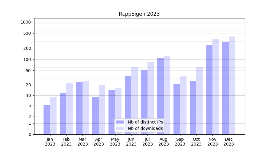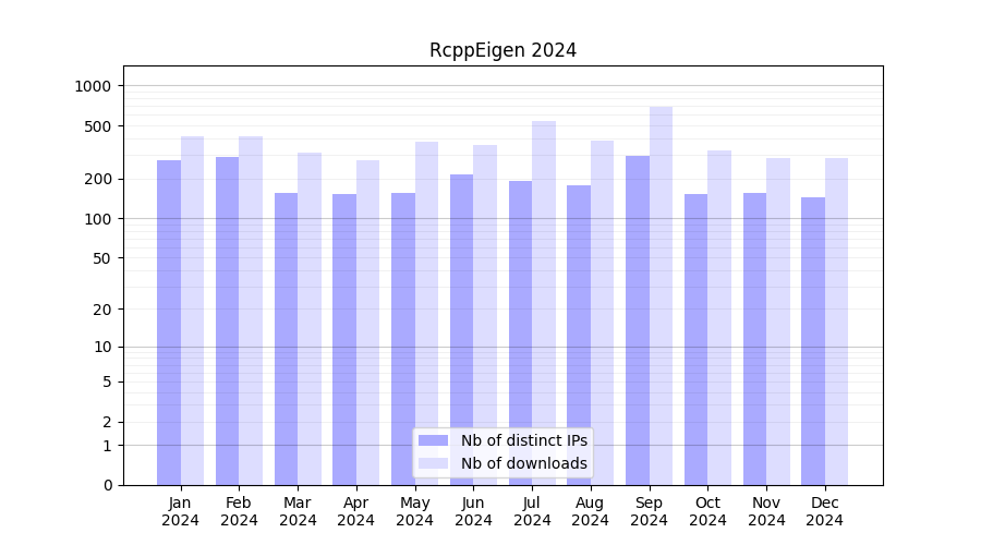 Number of downloads for annotation package RcppEigen, year by year, from 2025 back to 2014 (years with no downloads are omitted):