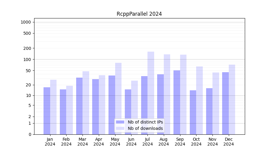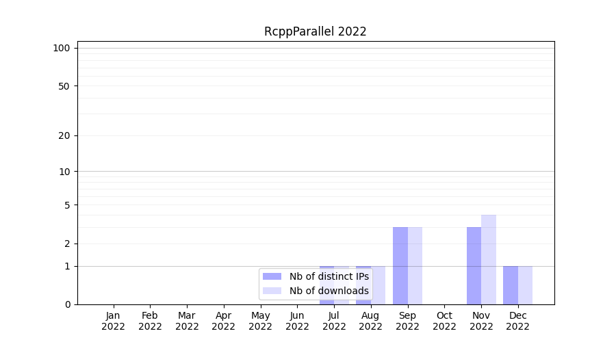 Number of downloads for annotation package RcppParallel, year by year, from 2025 back to 2014 (years with no downloads are omitted):