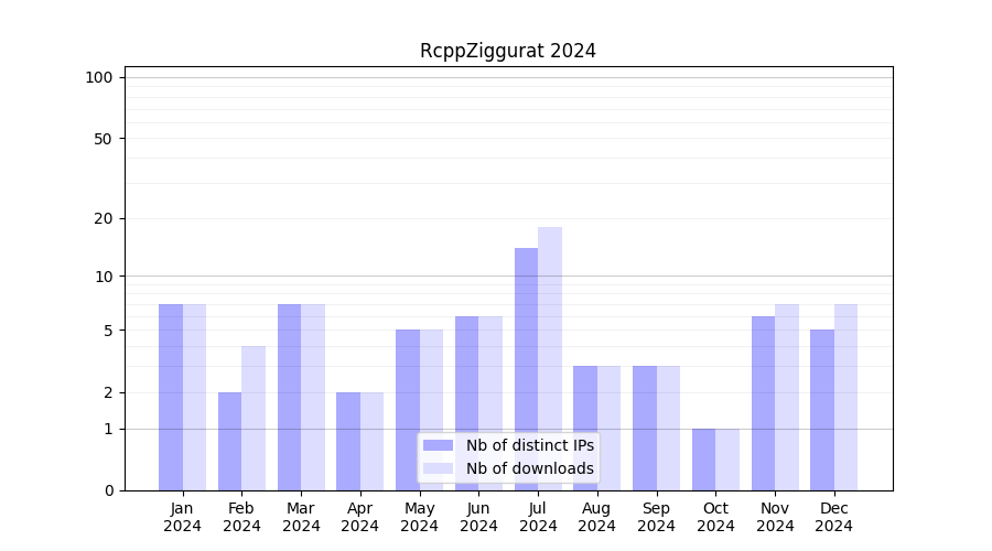 Number of downloads for annotation package RcppZiggurat, year by year, from 2025 back to 2014 (years with no downloads are omitted):