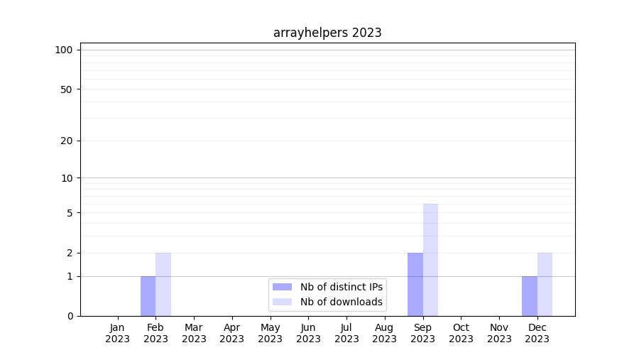 Number of downloads for annotation package arrayhelpers, year by year, from 2025 back to 2014 (years with no downloads are omitted):