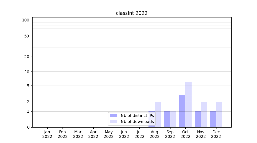 Number of downloads for annotation package classInt, year by year, from 2025 back to 2014 (years with no downloads are omitted):