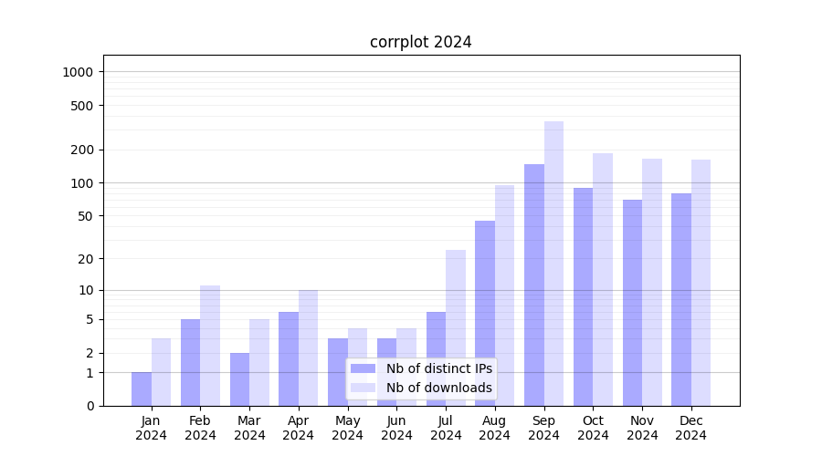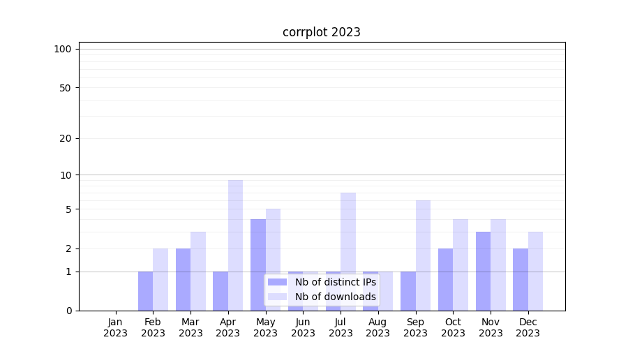 Number of downloads for annotation package corrplot, year by year, from 2025 back to 2014 (years with no downloads are omitted):