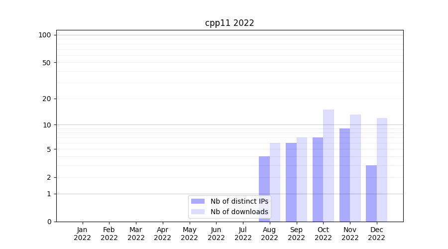 Number of downloads for annotation package cpp11, year by year, from 2025 back to 2014 (years with no downloads are omitted):