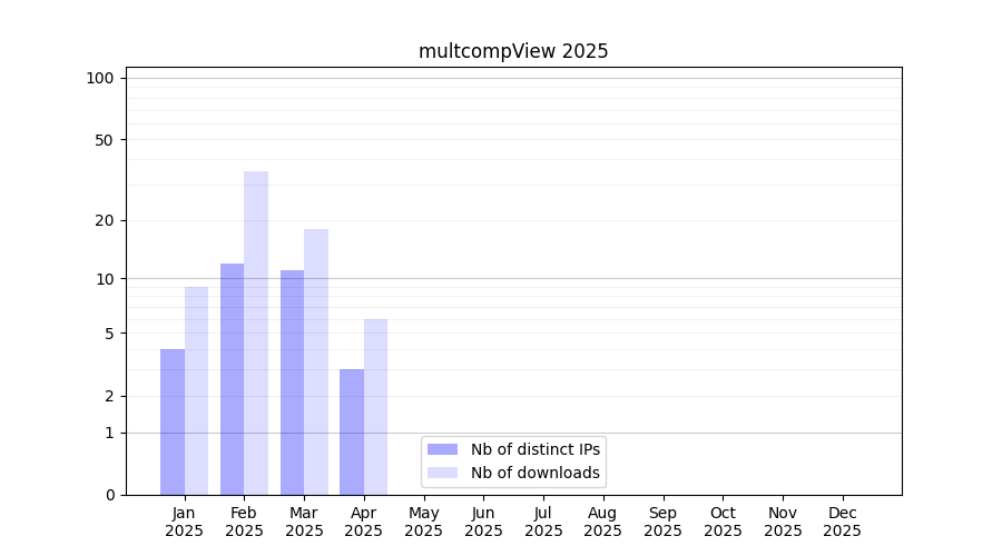 Number of downloads for annotation package multcompView, year by year, from 2025 back to 2014 (years with no downloads are omitted):