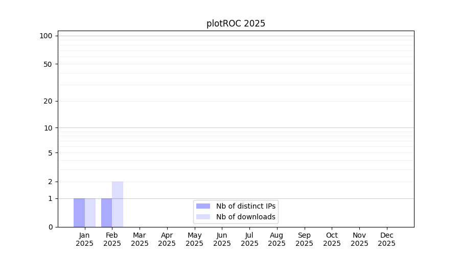 Number of downloads for annotation package plotROC, year by year, from 2025 back to 2014 (years with no downloads are omitted):