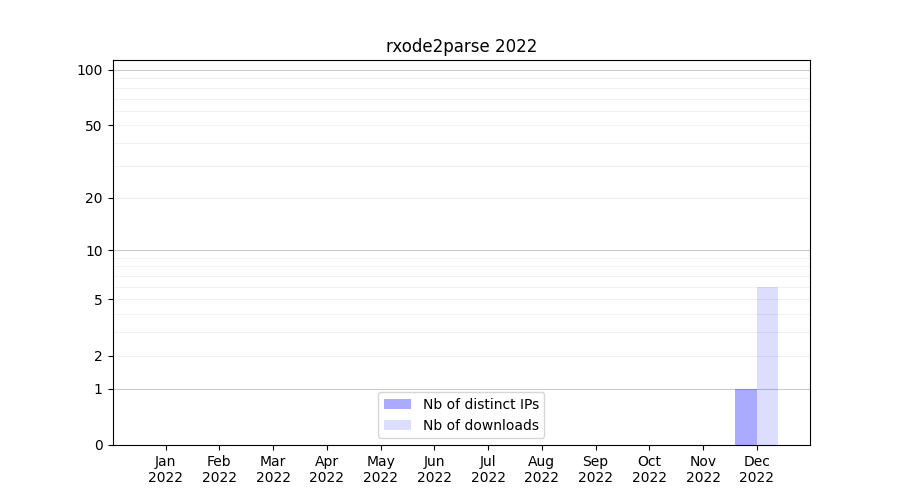 Number of downloads for annotation package rxode2parse, year by year, from 2025 back to 2014 (years with no downloads are omitted):