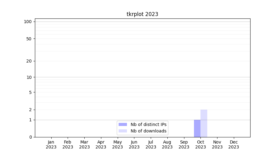 Number of downloads for annotation package tkrplot, year by year, from 2025 back to 2014 (years with no downloads are omitted):
