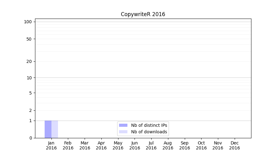 Number of downloads for experiment package CopywriteR, year by year, from 2025 back to 2014 (years with no downloads are omitted):