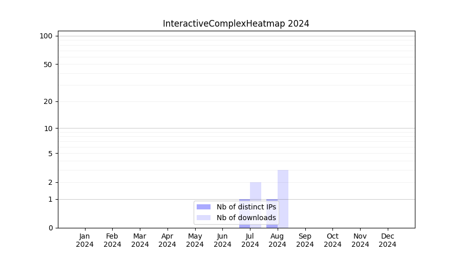 Number of downloads for experiment package InteractiveComplexHeatmap, year by year, from 2025 back to 2014 (years with no downloads are omitted):