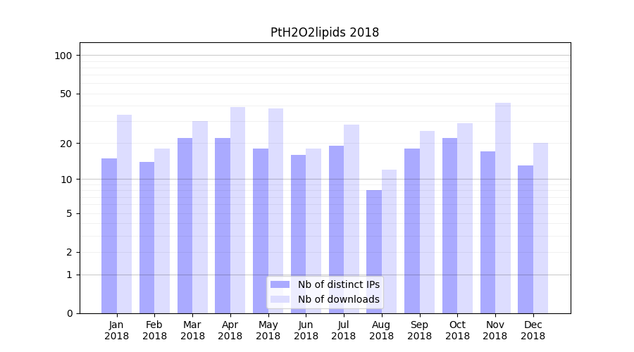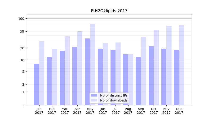 Number of downloads for experiment package PtH2O2lipids, year by year, from 2025 back to 2014 (years with no downloads are omitted):