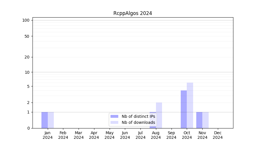 Number of downloads for experiment package RcppAlgos, year by year, from 2025 back to 2014 (years with no downloads are omitted):