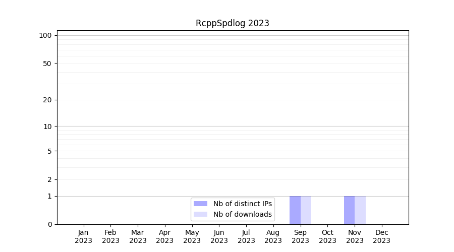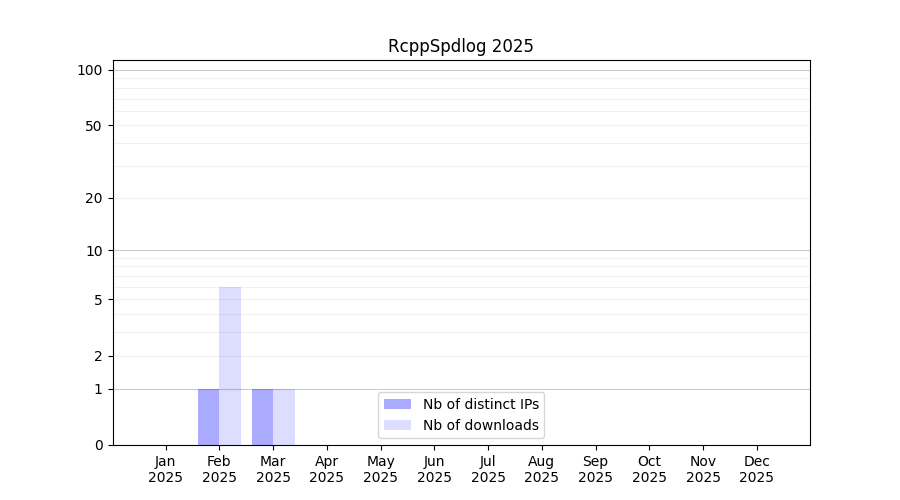 Number of downloads for experiment package RcppSpdlog, year by year, from 2025 back to 2014 (years with no downloads are omitted):