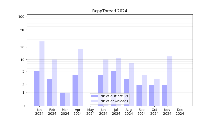 Number of downloads for experiment package RcppThread, year by year, from 2025 back to 2014 (years with no downloads are omitted):