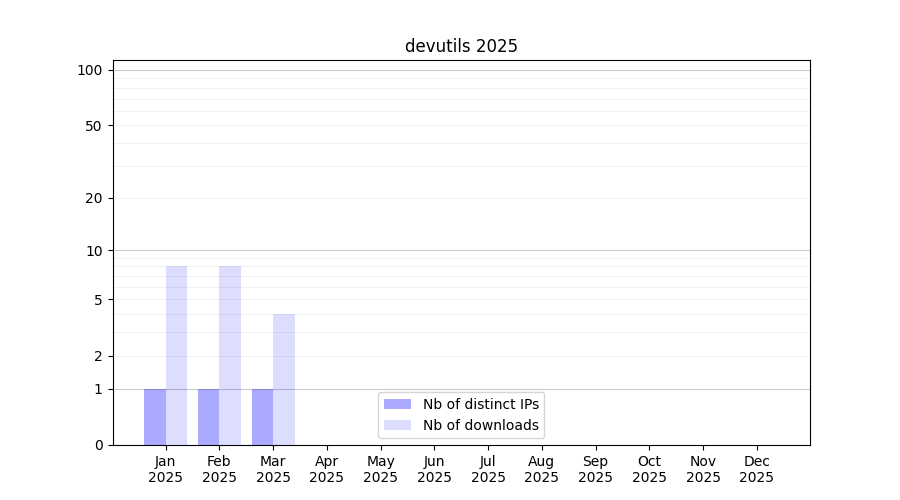 Number of downloads for experiment package devutils, year by year, from 2025 back to 2014 (years with no downloads are omitted):