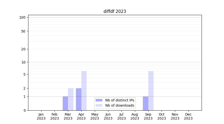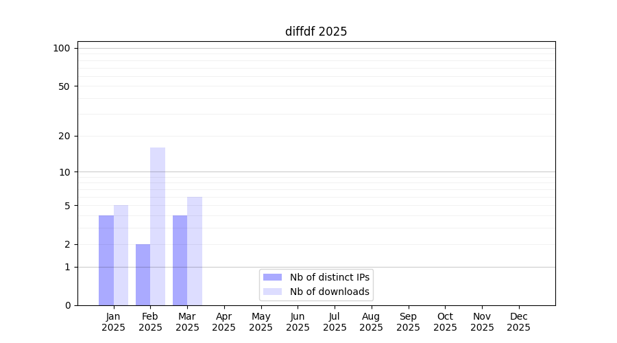 Number of downloads for experiment package diffdf, year by year, from 2025 back to 2014 (years with no downloads are omitted):