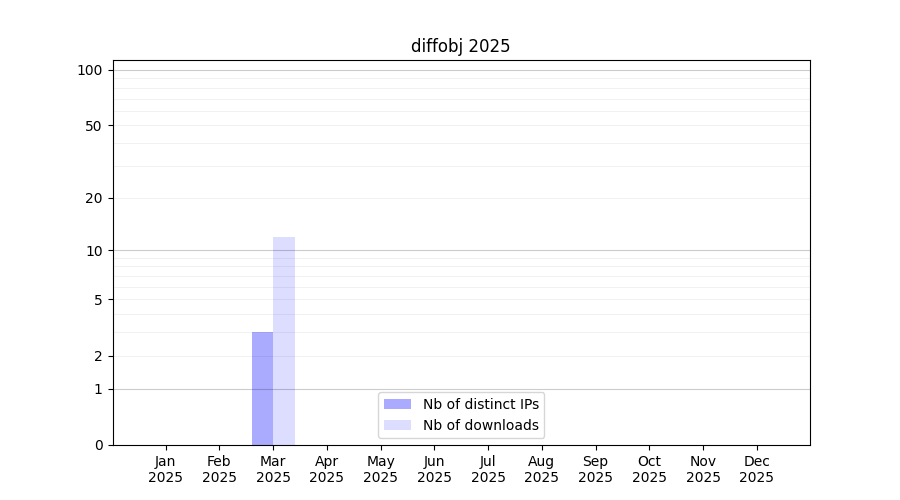 Number of downloads for experiment package diffobj, year by year, from 2025 back to 2014 (years with no downloads are omitted):