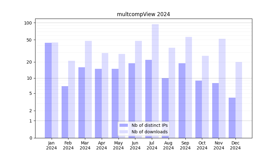 Number of downloads for experiment package multcompView, year by year, from 2025 back to 2014 (years with no downloads are omitted):