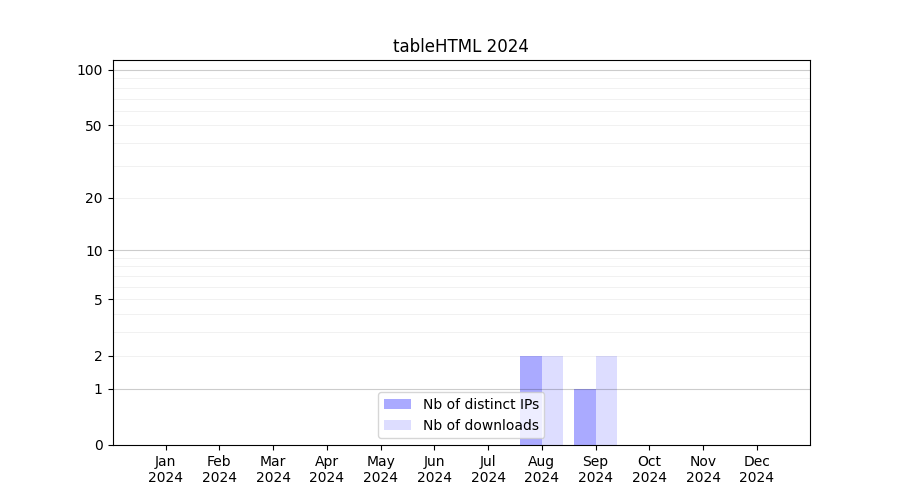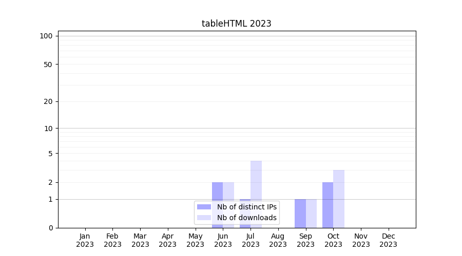 Number of downloads for experiment package tableHTML, year by year, from 2025 back to 2014 (years with no downloads are omitted):