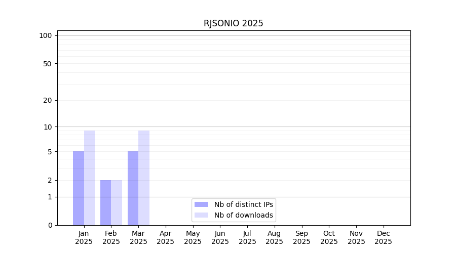 Number of downloads for workflow package RJSONIO, year by year, from 2025 back to 2015 (years with no downloads are omitted):