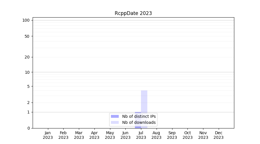Number of downloads for workflow package RcppDate, year by year, from 2025 back to 2015 (years with no downloads are omitted):