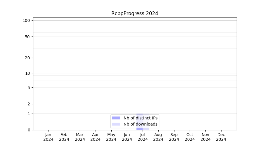 Number of downloads for workflow package RcppProgress, year by year, from 2025 back to 2015 (years with no downloads are omitted):