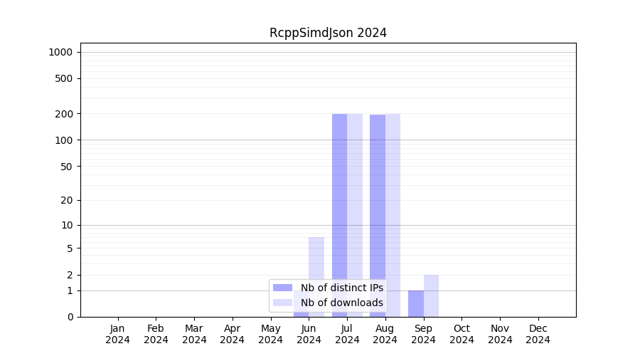 Number of downloads for workflow package RcppSimdJson, year by year, from 2025 back to 2015 (years with no downloads are omitted):