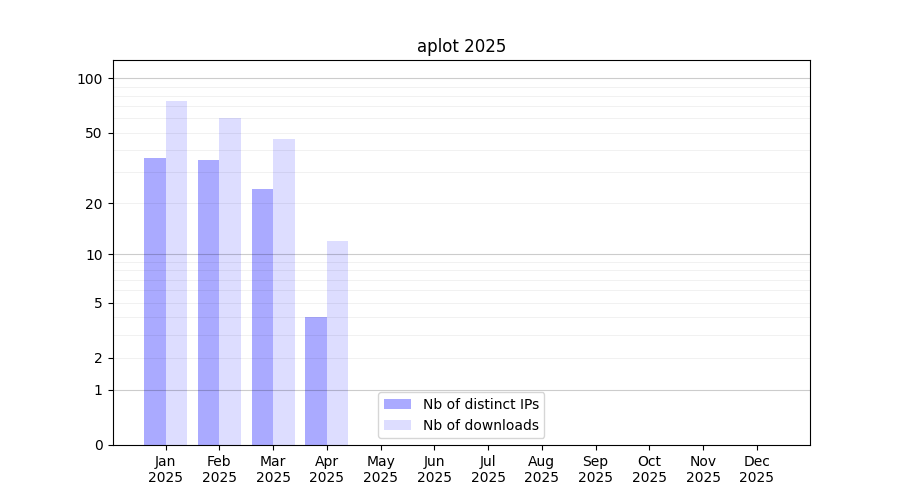 Number of downloads for workflow package aplot, year by year, from 2025 back to 2015 (years with no downloads are omitted):