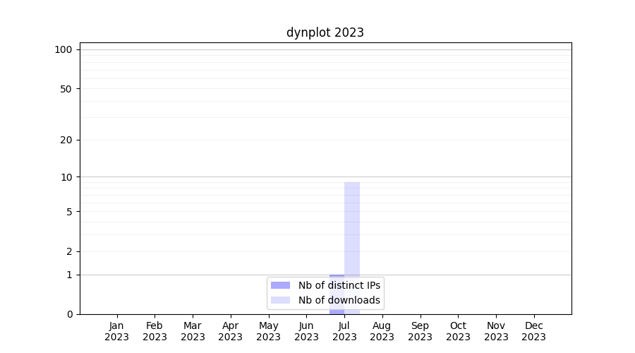 Number of downloads for workflow package dynplot, year by year, from 2025 back to 2015 (years with no downloads are omitted):