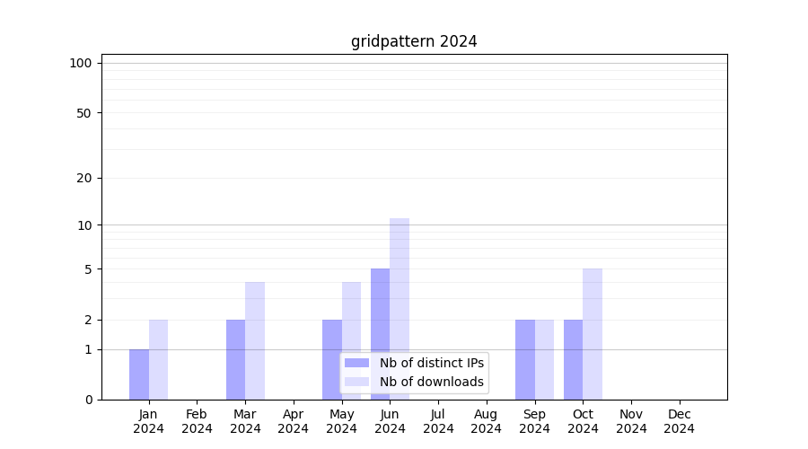 Number of downloads for workflow package gridpattern, year by year, from 2025 back to 2015 (years with no downloads are omitted):
