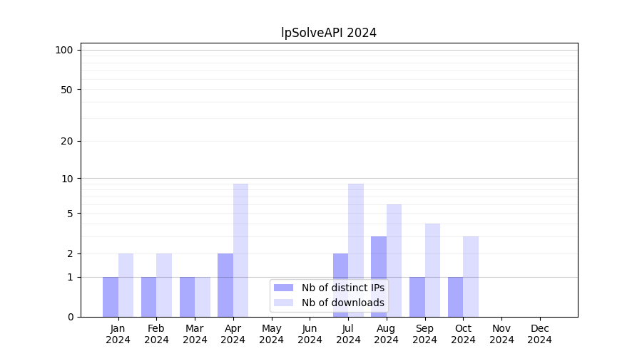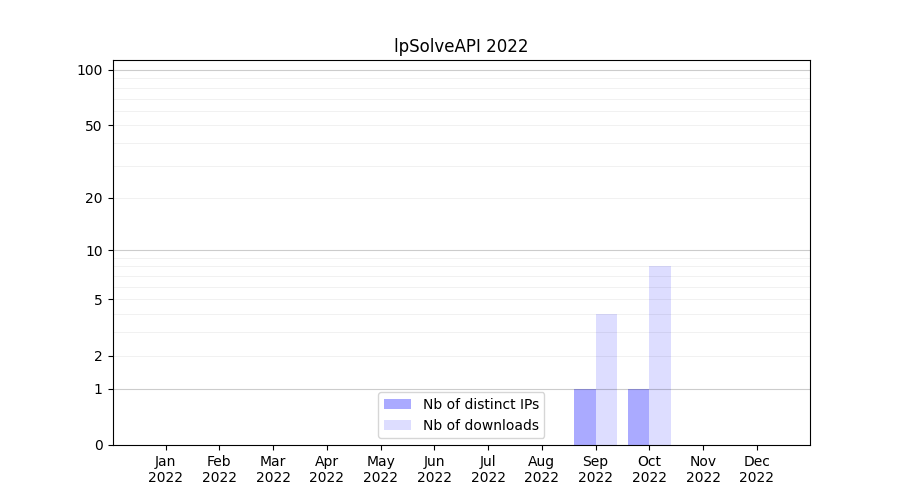 Number of downloads for workflow package lpSolveAPI, year by year, from 2025 back to 2015 (years with no downloads are omitted):