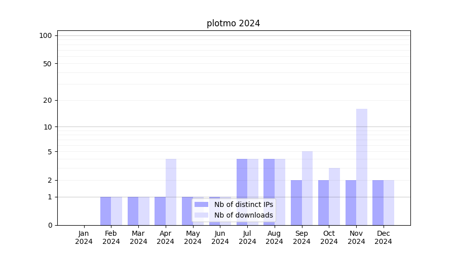 Number of downloads for workflow package plotmo, year by year, from 2025 back to 2015 (years with no downloads are omitted):