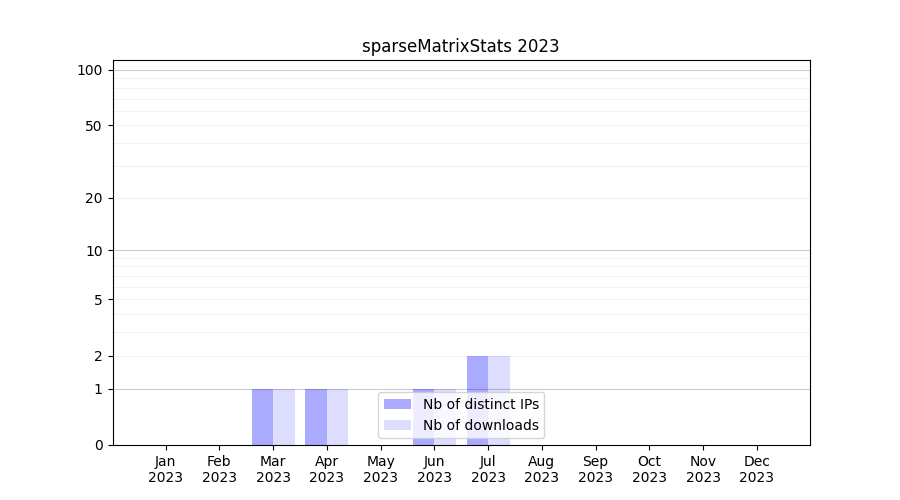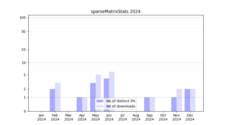 Number of downloads for workflow package sparseMatrixStats, year by year, from 2025 back to 2015 (years with no downloads are omitted):