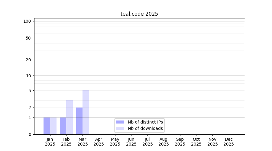 Number of downloads for workflow package teal.code, year by year, from 2025 back to 2015 (years with no downloads are omitted):