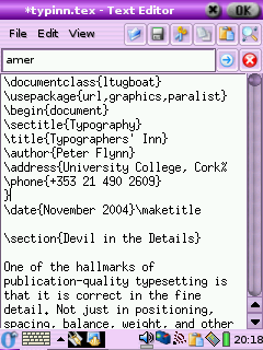 As we saw in Chapter 2, LATEX uses plain-text files, so they can be read and written by any standard application that can open text files. This helps preserve your information over time, as the plain-text format cannot be obsoleted or hijacked by any manufacturer or sectoral interest, and it will always be readable on any computer, from your handheld (yes, LATEX is available for some PDAs, see Figure 10.1) to the biggest supercomputer.
