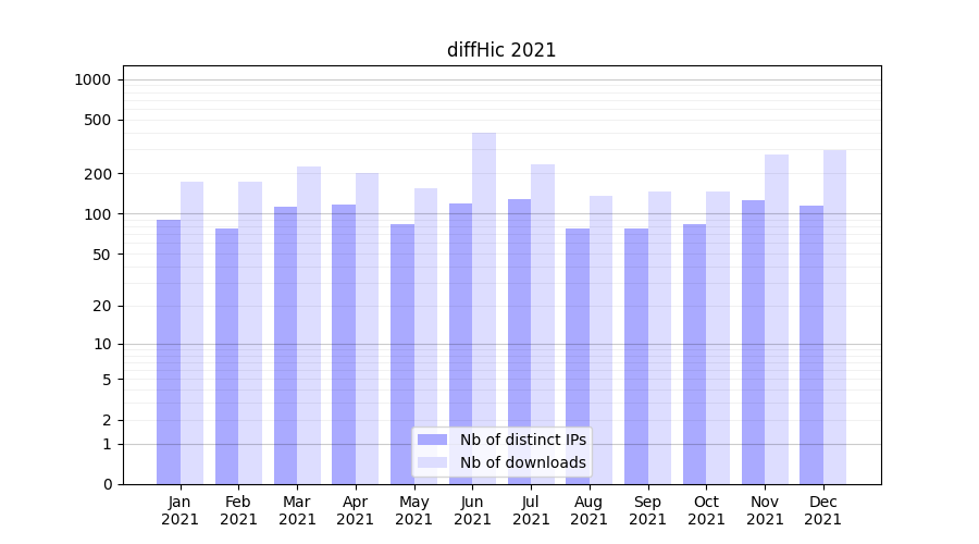 Number of downloads for software package diffHic, year by year, from 2025 back to 2014 (years with no downloads are omitted):