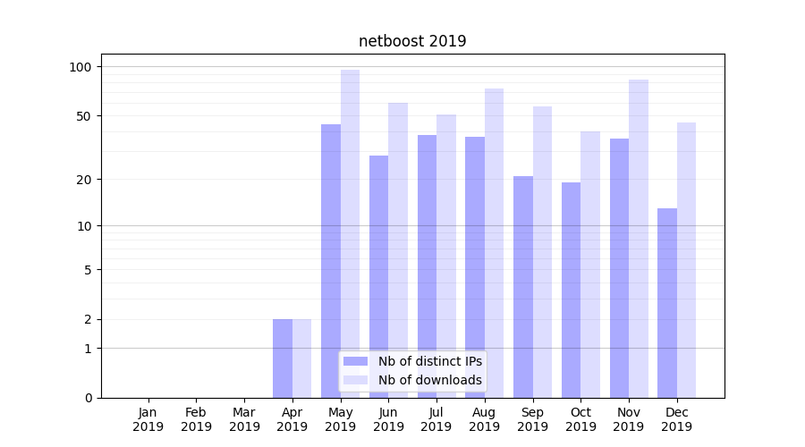 Number of downloads for software package netboost, year by year, from 2025 back to 2014 (years with no downloads are omitted):