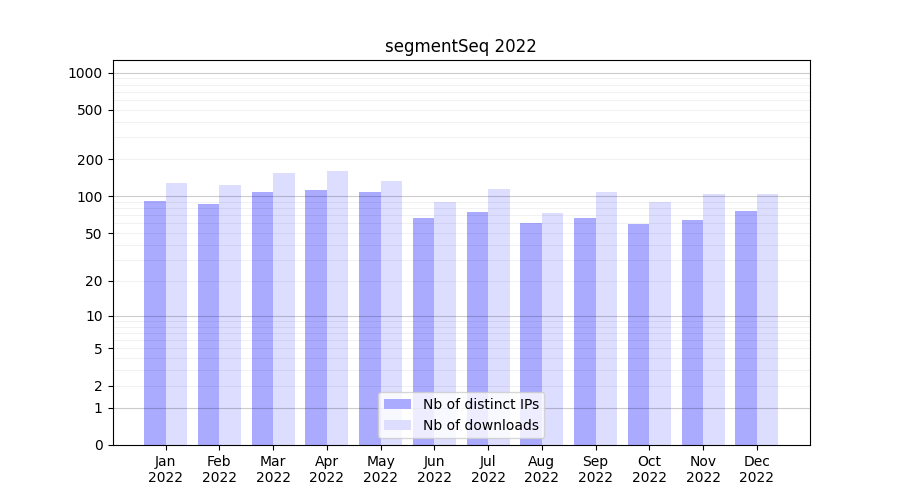 Number of downloads for software package segmentSeq, year by year, from 2025 back to 2014 (years with no downloads are omitted):